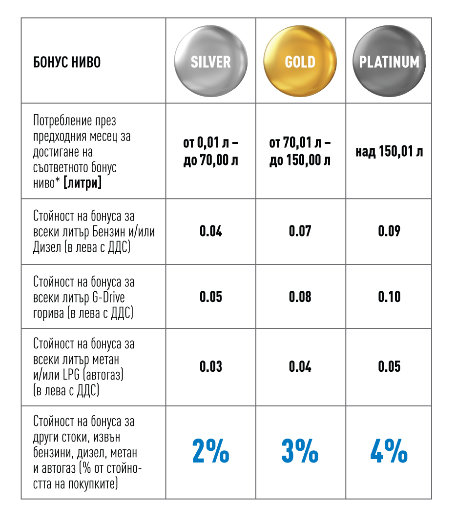 Стандартно всяка карта стартира на ниво „Silver“, което Ви носи 4ст. на литър при зареждане на бензин и дизел, 5ст. на литър при зареждане на G-Drive горива и 3ст. на литър при зареждане на метан и LPG (автогаз). При допълнителния асортимент получавате 2% бонус от стойността на покупките Ви през месеца. Ако потребление Ви на литри през текущия месец превиши сумата от 70,01 литра , през следващия месец картата Ви преминава автоматично на ниво „Gold“, при което получавате 7 ст. на литър при зареждане на бензин и дизел, 8ст. на литър при зареждане на G-Drive горива и 4ст. на литър при зареждане на метан и LPG (автогаз). При допълнителния асортимент нивото на бонусите нараства на 3% от стойността на покупките Ви. Най-високото ниво – „Platinum“ ще достигнете, ако потреблението Ви на литри през текущия месец е над 150,01 литра. Платинената карта ще Ви носи бонус от 9ст. на литър при зареждане на бензин и дизел, 10ст. на литър при зареждане на G-Drive горива и 5ст. на литър при зареждане на метан и LPG(автогаз). Също така получавате 4% от стойността на покупките Ви през текущия месец.